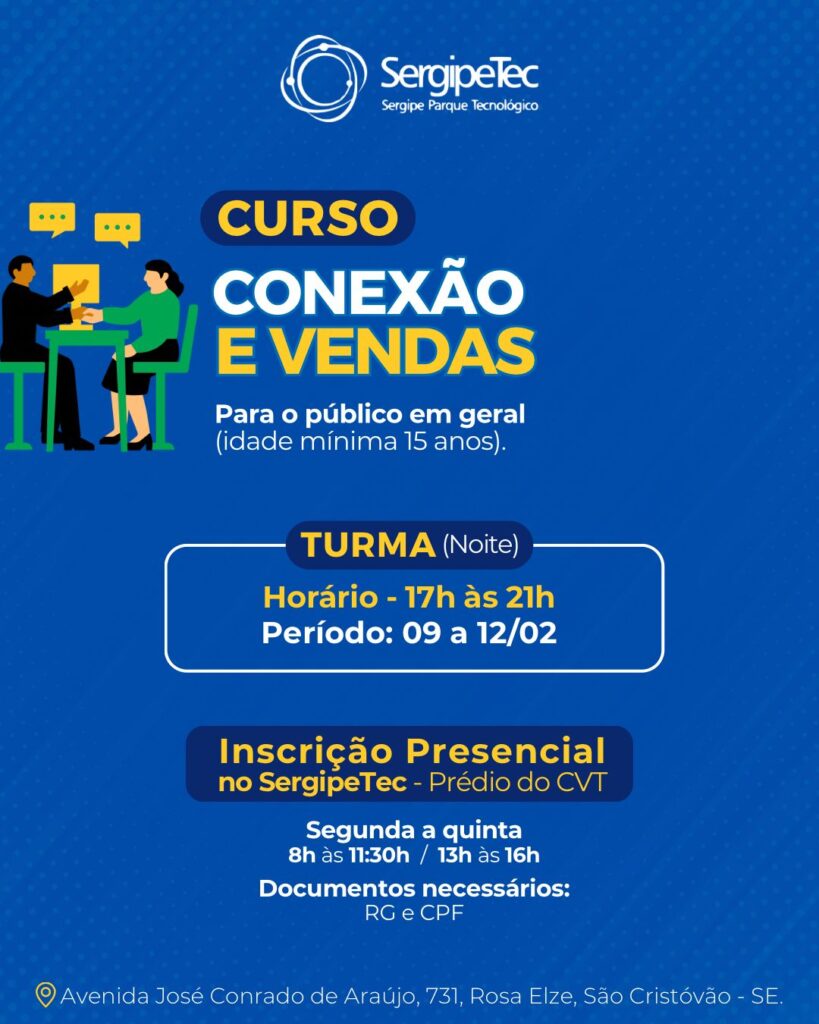 O SergipeTec, por meio do Centro Vocacional Tecnológico (CVT), realiza o Curso Gratuito de Conexão e Vendas, uma capacitação voltada para quem deseja transformar o atendimento ao cliente em uma poderosa ferramenta de vendas. Durante o curso, os participantes aprenderão a se comunicar com empatia e transparência, resolver problemas de forma rápida e eficiente e criar conexões genuínas que fazem o cliente se sentir valorizado, aumentando significativamente as chances de fechamento de vendas.